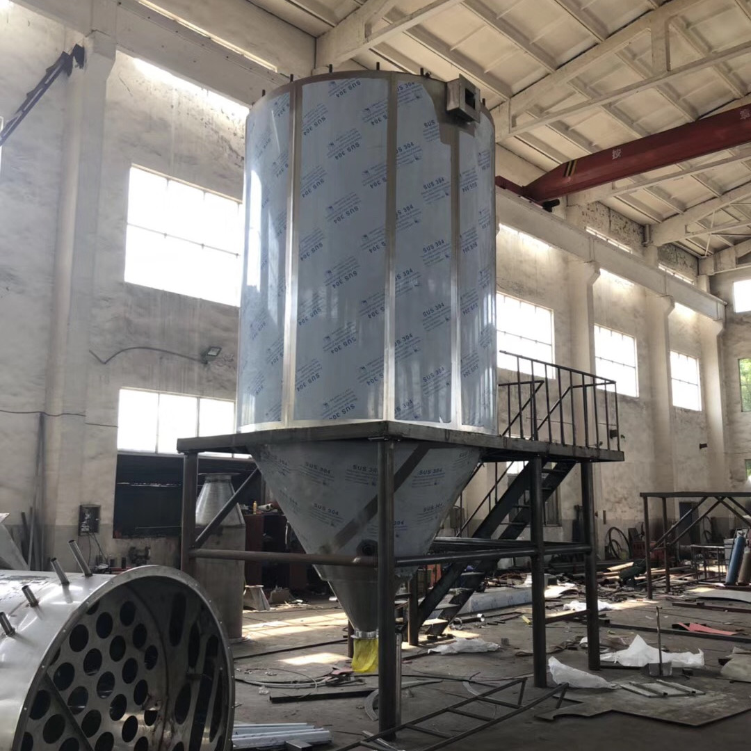 بعد الترشيح والتسخين ، يدخل الهواء النقي الساخن إلى موزع الهواء أعلى حجرة التجفيف ، ويتم توزيعه بطريقة حلزونية بشكل موحد من أعلى إلى أسفل.في نفس الوقت ، يتم ضخ سائل التغذية إلى البخاخة العلوية ، ثم يتم رشها إلى قطرة سائل ضباب دقيقة للغاية.خلال وقت قصير من الاتصال المباشر مع الهواء الساخن ، تبخرت الرطوبة دفعة واحدة ، وتبقى المادة الصلبة عبارة عن مسحوق.سيتم تفريغ المسحوق الجاف باستمرار من قاع برج التجفيف ومجمع الإعصار ، وسيتم تفريغ هواء العادم بعد التنظيف.