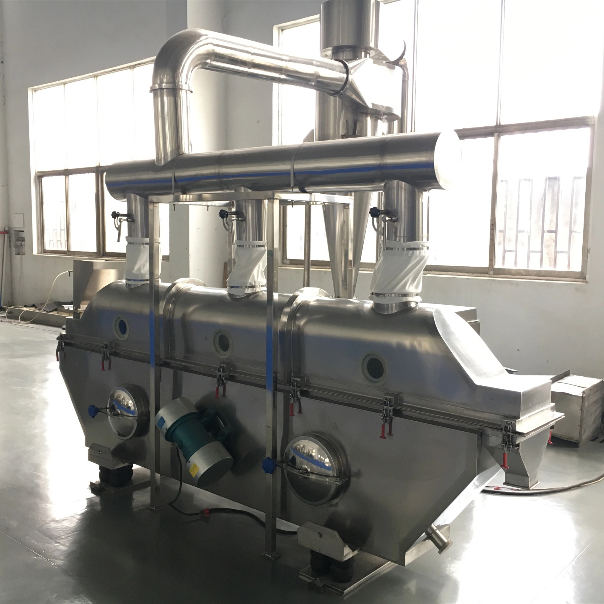 مجفف السرير المميع بالاهتزاز الصناعي ينطبق على الكيماويات والأدوية والأغذية والخضروات المجففة والأغذية والمعادن وغيرها من مسحوق الصناعات والمواد الحبيبية والجافة والتبريد وغيرها من العمليات.